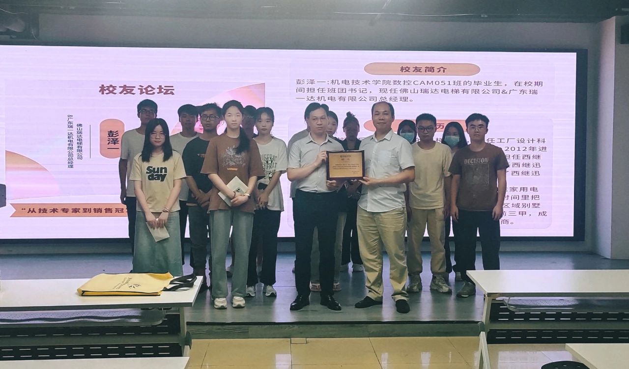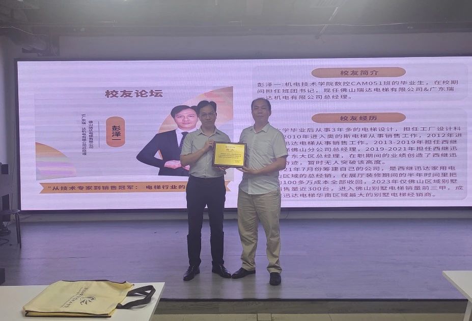 2024年5月28日下午,在学校双创中心路演厅, 数控CAM051班杰出校友彭泽一师兄以其丰富的职业生涯发展经验,为师生们带来了一场题为“从技术专家到销售冠军:电梯行业的创业故事”的讲座。