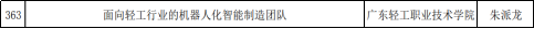 机电技术学院创新驱动发展,探索未来制造,坚持设计轻工、制造轻工、服务轻工理念打造科研团队。机电技术学院精英教师团队组建高水平科研团队,以朱派龙教授为领军人物,携手专注机器人技术杜亮博士和特种加工及涂层领域的专家邝子奇教授级高级工程师,汇聚了学院各专业教师的智慧与经验。团队研究聚焦轻工行业的机器人化智能制造,特别是精密磨削和超精密磨削技术,推动产业向高效率、高精度转型,可以为轻工行业的智能制造带来革命性的进步,为合作伙伴创造更大的价值。团队旨在为广东省,尤其是粤港澳大湾区的轻工企业提供定制化的生产线升级方案,以机器人技术为驱动,推动产业升级。