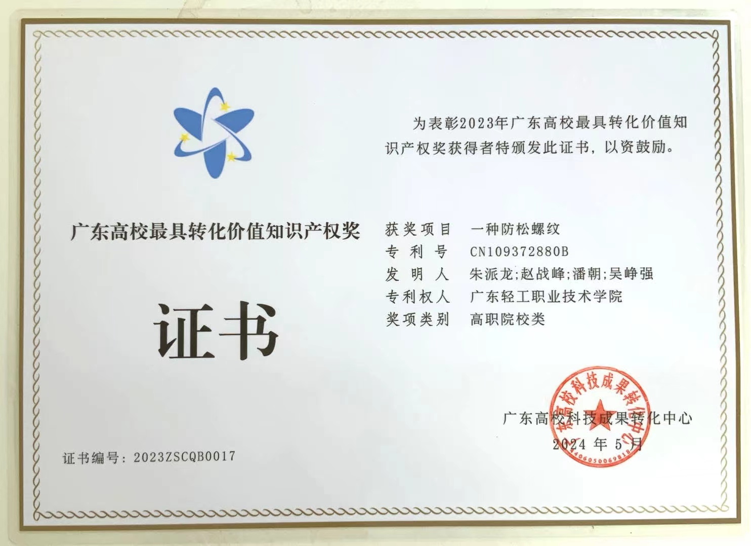 日前,备受业界关注的2023年广东高校最具转化价值知识产权奖名单奖在广州揭晓,我院朱派龙教授《一种防松螺纹》专利,荣获此殊荣。