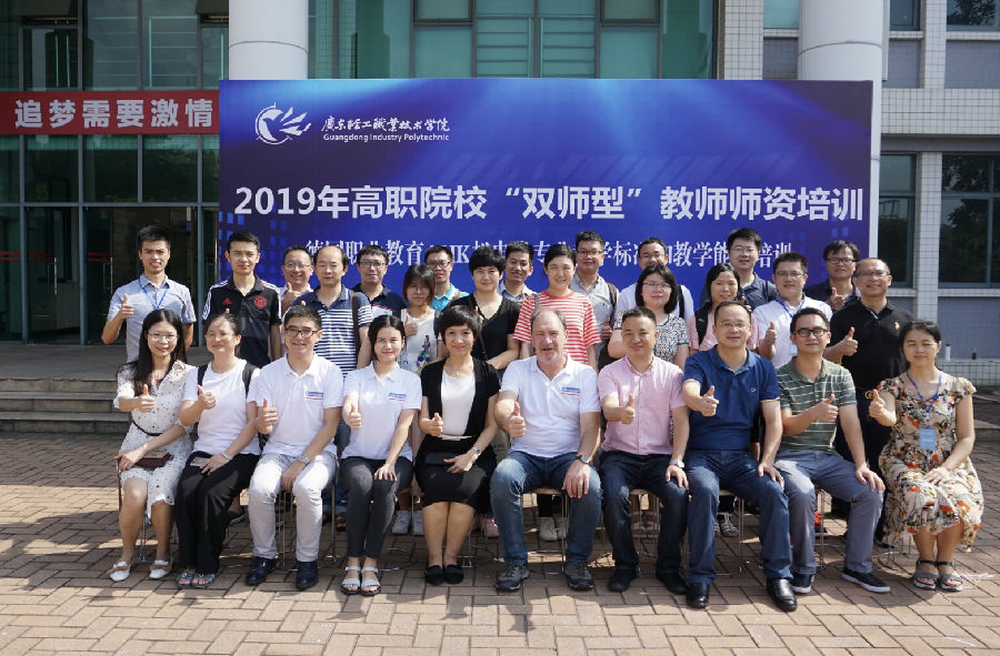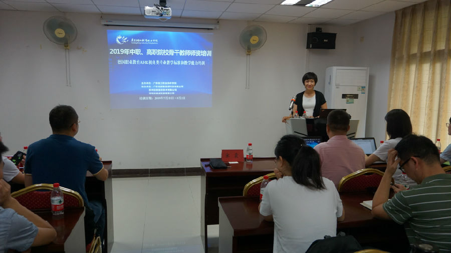 7月14日上午,广东轻工职业技术学院机电技术学院主办的“2019年中职、高职德国职业教育AHK机电类专业教学标准和教学能力培训班(国培)”正式开班。机电技术学院党总支书记宋霞、副院长李湘伟、德国职教专家哈尼勒、广东恺鹏勒公司代表程蕾、深圳技成公司代表王学军等领导出席了开班典礼,李湘伟副院长主持本次典礼。本次2个培训班共有来自广东省内20所中职、15所高职院校50多名骨干教师参加。