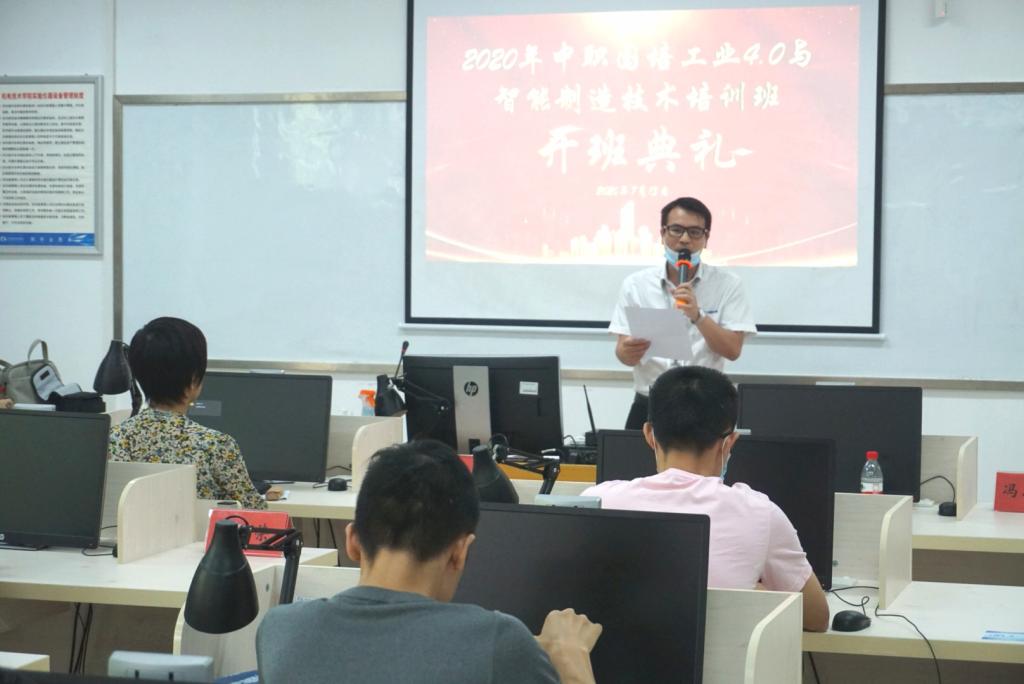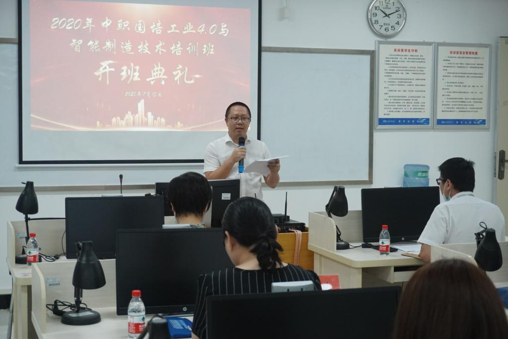 2020年,一场特殊的新冠肺炎疫情倒逼制造企业数字化转型,新工业革命时代,智能制造大势所趋,新技术、新应用层出不穷,新时代职业教育的发展正当其时。 按照《广东省教育厅关于做好2020年广东省中等职业学校国家级培训工作的通知》的要求,在克服种种困难,做好疫情防控的前提下,7月13日上午,由广东轻工职业技术学院机电技术学院和佛山华数机器人有限公司联合举办的“2020 年工业 4.0 和智能制造专业技术培训(国培)”在我校第四实训楼C105隆重举行开班典礼,机电技术学院党总支书记宋霞、副院长苑振国、佛山华数机器人有限公司副总经理冯小童等领导出席了开班典礼,共有来自广东、贵州十几所院校30多名骨干教师参加本次培训。开班典礼由苑振国主持。