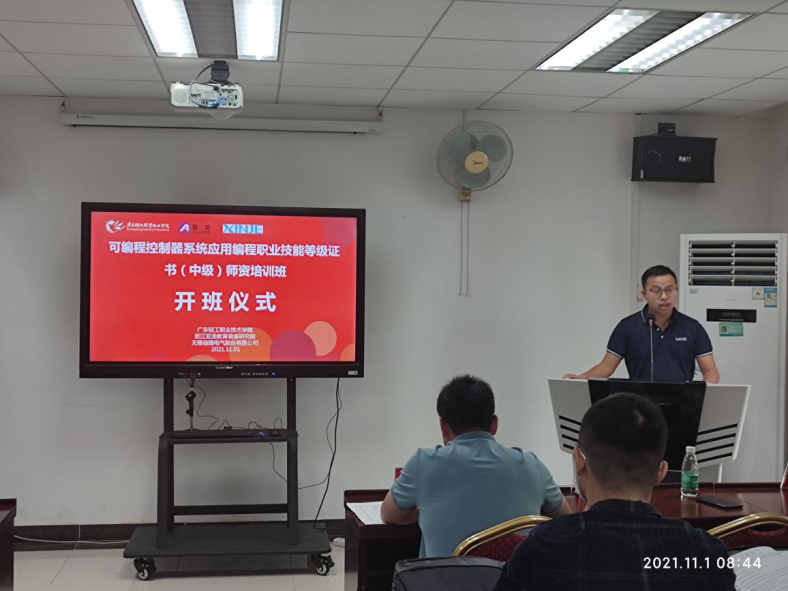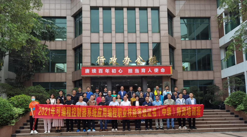 11月1日上午,由我院与亚龙智能装备集团股份有限公司、无锡信捷电气股份有限公司联合举办的“可编程控制器系统应用编程职业技能等级证书(中级)师资培训班”正式开班。亚龙智能装备集团股份有限公司华南区总监陈少明、无锡信捷电气股份有限公司华南区总监蓝国亮、机电技术学院党总支书记宋霞、副院长苑振国、电气教研室主任刘鲁、副主任王芳楷、浙江亚龙教育装备研究院和无锡信捷电气股份有限公司讲师团和考评员、以及来自省内11所中高职院校共40名电气领域骨干教师参加了此次开班仪式。