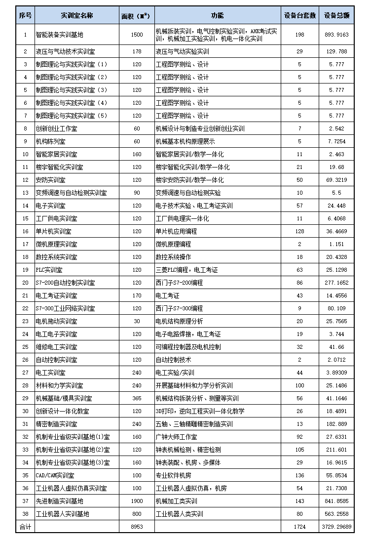 机电技术学院实训室紧密围绕产业升级人才需求,专业群具备优质的教学实训条件,拥有国家级、省级实训基地,设备先进、保障有力。拥有国家级生产性实训基地1个:先进制造技术及检测公共实训中心;省级实训基地2个:机械制造与自动化(精密制造方向)实训基地、数控技术实训基地;校级实训基地1个:智能装备校级实训基地。还建设有占地面积近4400平方米的智能制造产教工业园(含先进制造实训基地、工业机器人实训基地、智能装备实训基地)。共有实训室(基地)38个。各种教学实训设备总价值达3729万元。专业群实训基地集教学、科研、培训等功能于一体,设备种类齐全、具备完整的轻工智能制造产业链所需工作岗位的培训能力。专业群校内实践教学仪器设备完全符合教育部专业仪器设备装备标准,符合度达到100%。专业群校内实践教学设施设备的完好率为100%,设备利用率达到了90%以上。