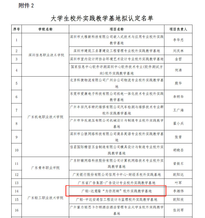 广轻-达意隆“为你而转”校外实践教学基地被拟认定为省高职教育大学生校外实践教学基地