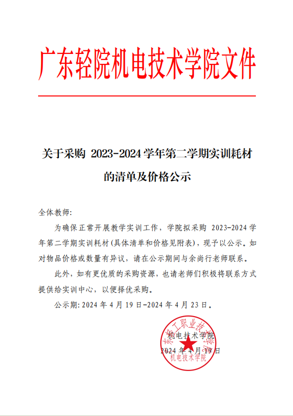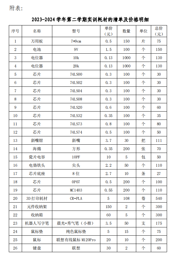 关于采购 2023-2024学年第二学期实训耗材的清单及价格公示