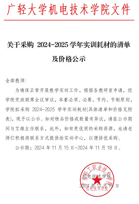 关于采购 2024-2025学年实训耗材的清单及价格公示