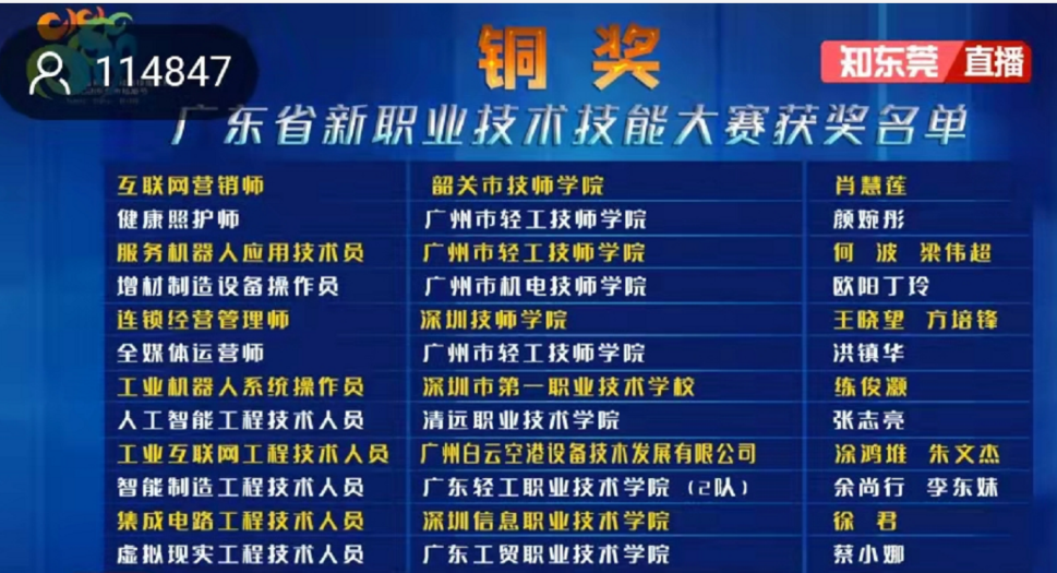 10月14日,广东省新职业技术技能大赛智能制造工程技术人员项目赛项在广东轻工职业技术学院南海校区开幕,来自全省多个职业院校、技师、技工院校、企业共20支队伍40名选手同台竞技。我校机电技术学院毛诗柱、廖辉老师组成的一队勇夺金奖,经省人力资源社会保障厅核准后将授予“广东省技术能手”荣誉称号,并将代表广东省参加国赛;机电技术学院余尚行、李东妹组成的二队勇夺铜奖。