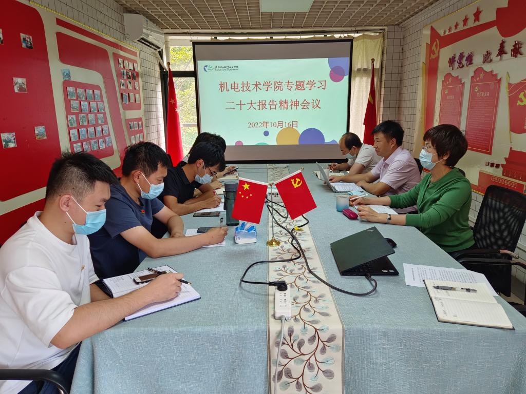 10月16日上午,中国共产党第二十次全国代表大会在北京顺利开幕,中共中央总书记、国家主席、中央军委主席习近平发表重要讲话。机电技术学院教职工收看了党的二十大开幕盛况,认真聆听了习近平总书记发表的重要讲话。为深入领会党的二十大精神,10月16日下午,机电技术学院在行政楼2200召开了专题学习贯彻党的二十大精神交流会,机电技术学院党总支书记宋霞主持会议,出席会议的有院长张友能、副院长毛诗柱、党政办主任黄旭武和部分辅导员。