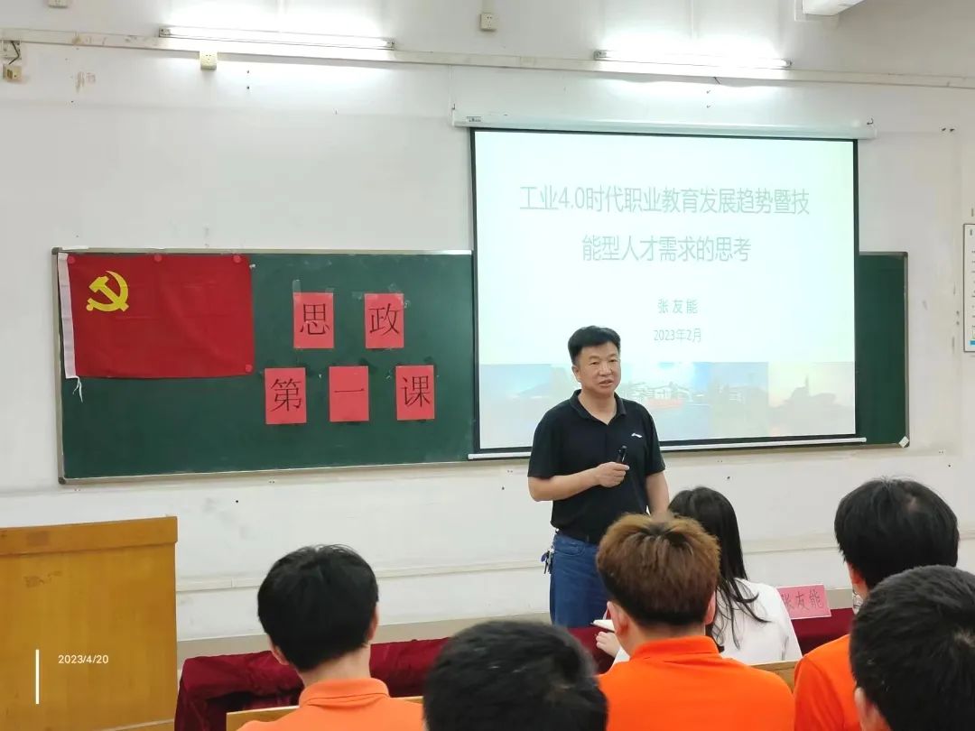 为深入学习贯彻党的二十大精神,宣传贯彻党的教育方针,教育引导党员、入党发展对象和入党积极分子提高思想觉悟、扎实学识本领、掌握专业技能、为全面建设社会主义现代化强国提供有力人才和技能支撑,2023年4月20日晚上7:00,机电技术学院党总支在南海北区教学楼2208教室举行院长思政第一课。机电技术学院院长张友能、学生第一党支部书记林锦秀、教务员张佳妮出席本次思政第一课,部分党员、入党发展对象和入党积极分子代表参加。