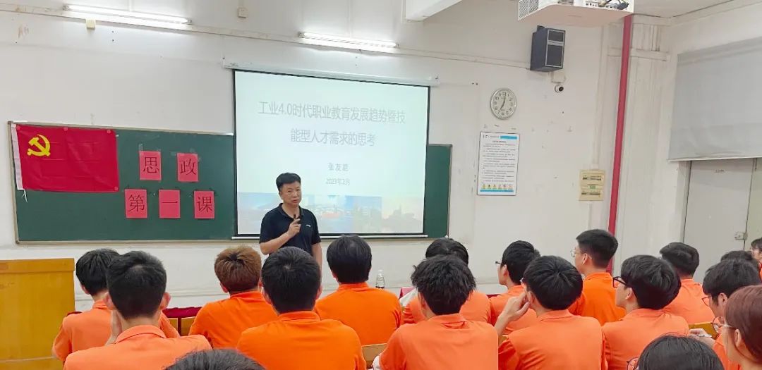 张友能院长以“工业4.0时代职业教育发展趋势暨技能型人才需求的思考”为题给学生带来精彩的思政第一课。张友能院长首先引用《党的二十大报告》中关于职业教育的有关内容:统筹职业教育、高等教育、继续教育协同创新,推进职普融合、产教融合、科教融汇,优化职业教育类型定位。张院长指出这为今后一个时期职业教育构建新发展格局、高质量发展奠定基础、指明方向。