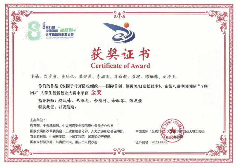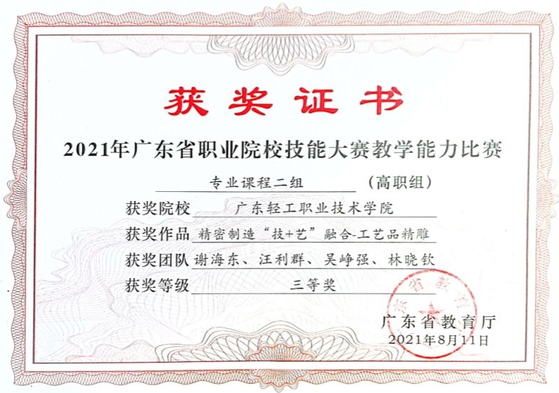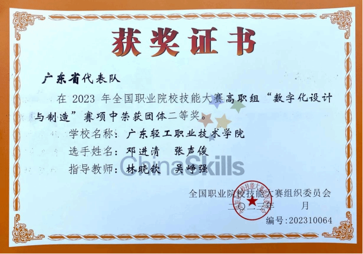 学生获得第十四届“挑战杯”秦创原中国大学生创业计划竞赛金奖;学生获第八届中国国际“互联网+”大学生创新创业大赛金奖,获第八届、第九届中国国际“互联网+”大学生创新创业大赛广东省金奖,获第十七届挑战杯《高端永不松动螺纹副国产替代研究及其产业化》“卫星”级作品,获广东省大学生“挑战杯”项目一等奖;职业技能竞赛方面,获国家级二等奖1项,国家级三等奖2项,省级一等奖5项,省级二等奖5项,获省级三等奖12项。