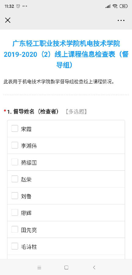 学院二级督导检查:组建班子成员、教研室主任、每个教研室一名老教师共14名教师组成的管理人员、多名资深教师组成的学院二级督导组,领导班子成员对口一个教研室,教研室督导对口本教研室老师,开展线上听课,并及时填写《线上课程信息检查表》。