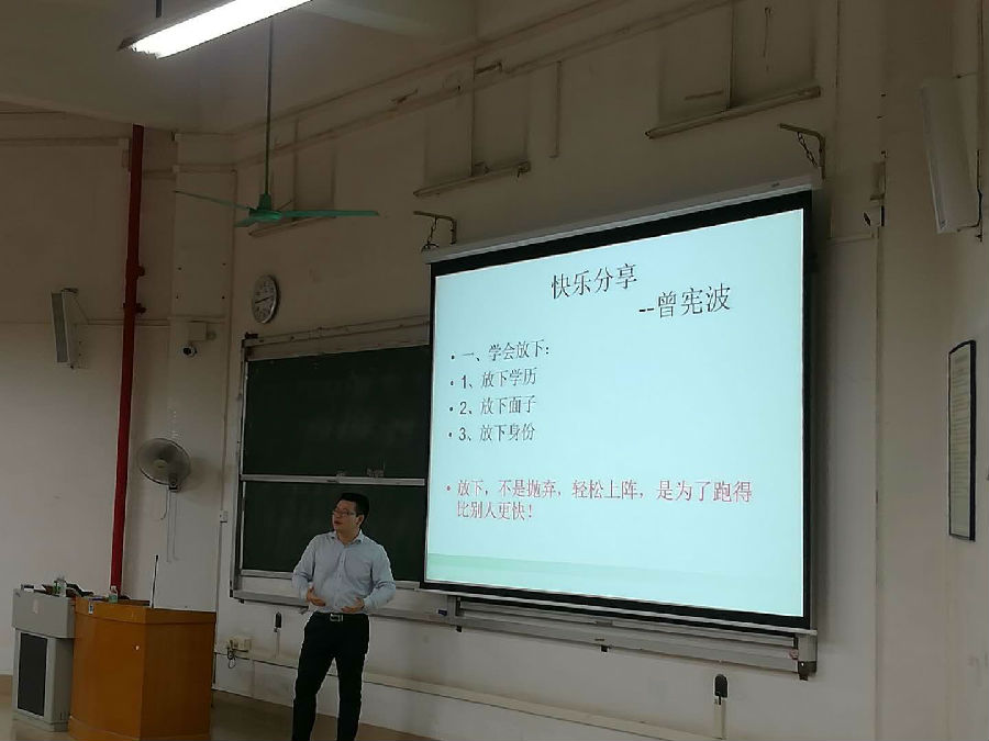 曾宪波师兄从四个方面为我们展开了“快乐分享”。阐述了在学习、工作的过程中要做到“学会放下”,即学会放下学历、放下面子、放下身份,这将带来不一样的收获。放下并不是指抛弃,轻松上阵是为了跑得比别人更快。他说,同学们更应该懂得学以致用,厚积薄发,读万卷书才能走万里路,现阶段最该做的就是学好功夫等待机遇。同时,曾师兄估计同学们要敢于担当,明白能力越大责任越大,所谓“功不独居,过不推诿”。更重要的是,该志存高远更应当脚踏实地,以国家富强、人民幸福为己任,胸怀理想、志存高远。正是只有脚踏实地才能仰望星空!