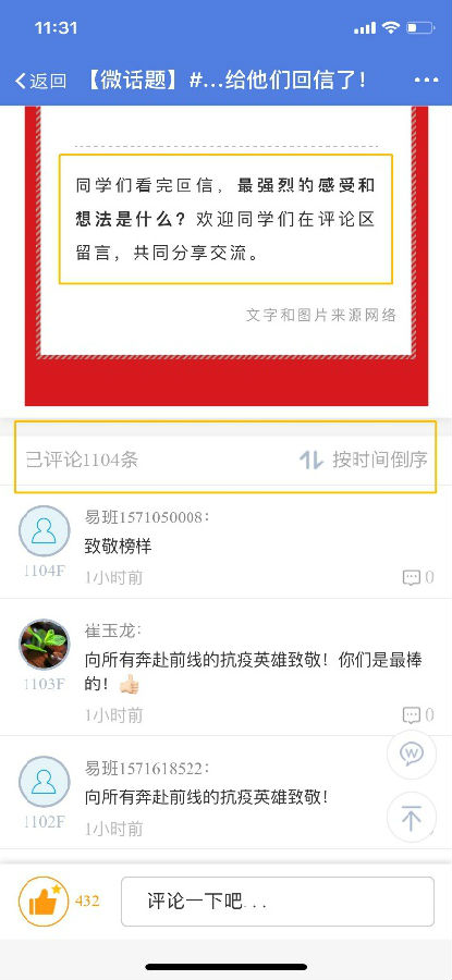 该活动发起后,同学们积极参与,当天共有1000多名同学参与留言,阅读量超3000。