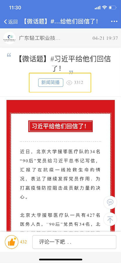 近段时间以来,全国各高校纷纷开展大学习、大讨论、大实践,掀起了全国范围内学习习近平总书记重要回信精神的热潮。我院易班工作站采用微话题留言的形式,动员同学们在评论区留言,分享自己的心得感受。