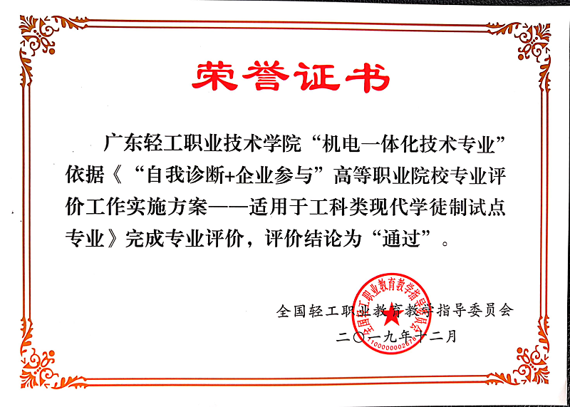 “自我诊断+企业参与”专业评价是我校省一流高职建设和省示范院校建设项目,评价标准及方案历时三年不断完善,被全国轻工职业教育教学指导委员会采纳并对试点通过专业颁发荣誉证书。我校机电一体化技术专业现代学徒制试点工作顺利通过评价,评价的结果客观地反映出我校机电一体化技术专业现代学徒制人才培养的水平。