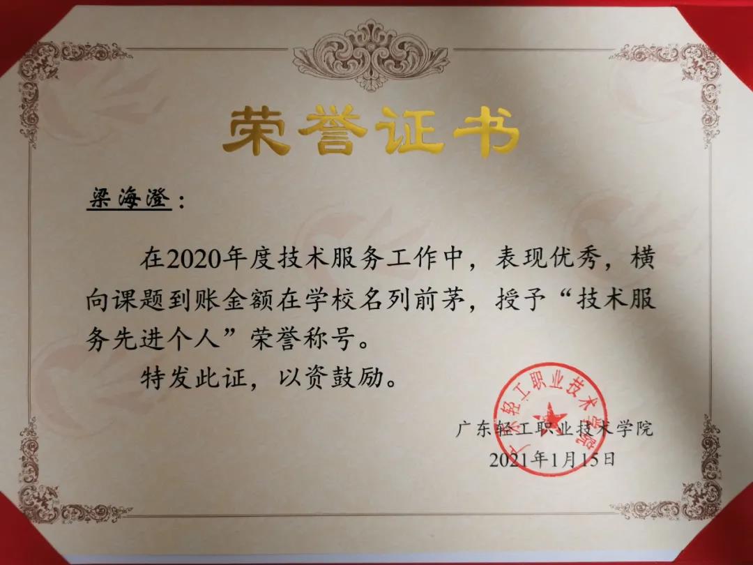 在技术服务工作中,梁海澄老师技术服务业绩突出,获横向到账36万元,被授予“技术服务先进个人”荣誉称号!