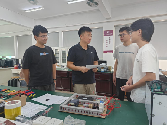 项目组成员电气201班陆俊杰介绍:“我们作品的模型源于指导老师的课题研究。戴钰老师和刘鲁老师鼓励我们将课堂和书本上学到的理论付诸实践,并细致耐心地指导我们制作。我深刻感受到亲手实操的重要性,也真正体会到“用手思考”意义。指导老师们在这期间全程陪伴我们,给我们指引方向,他们不仅仅给我们作品的设计制造指明了方向,还用心地从各方各面培养我们,让我们成为懂得思考,有行动力的人。能够参与其中,我感到无比幸运。我们还得到院长张友能教授的指导和宋霞书记的支持。备战期间,张院长多次来现场指导我们团队,鼓励我们选手,指导十分细致,我们团队特别感谢老师们,觉得特别幸运。”
