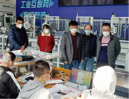 梅建波一行先后到实训基地和教学楼探望了机器视觉系统应用、机器人系统集成、工业机器人技术应用、机电一体化项目、复杂部件数控多轴联动加工技术、风光互补发电系统安装与调试、现代电气控制系统安装与调试7支备赛团队师生。他传达了学校关于疫情防控工作的最新部署,对备赛学生自愿留校训练和其付出的努力表示充分肯定,为所有备赛团队加油鼓劲。他对备赛团队及指导教师提出了三点要求:一是要充分掌握学生的训练情况,有针对性开展训练,切实提高训练成效;二是要注意劳逸结合,适度开展体能训练和心理辅导,保持最佳的备战训练状态;三是要关爱学生,扎实做好疫情防控及训练后勤保障。