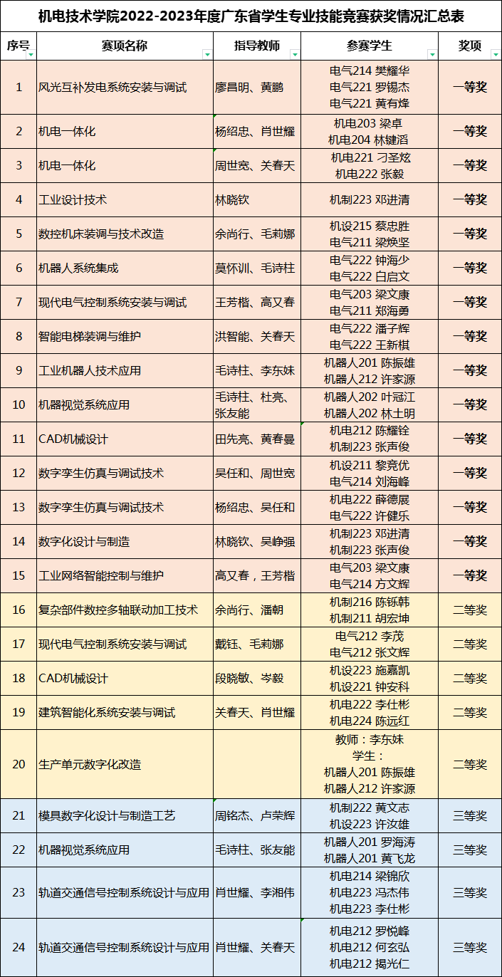近期,由广东省教育厅主办的2022-2023年度广东省职业院校学生专业技能大赛拉开了帷幕。我院学子奋力拼搏,共获15个一等奖,5个二等奖,4个三等奖,赛项参赛队伍获奖率达100%,这是我院在学生技能竞赛历史上最好的成绩!