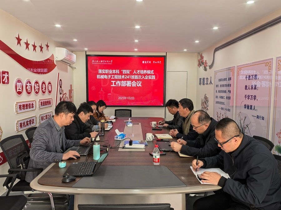 为探索职业本科人才培养路径,增强职业教育在产业发展中的适应性,学院推动构建“双场景”(学校场景+企业场景)、“双文化”(校园文化+企业文化)、“双项目”(科技创新项目+社会实践项目)、“双证书”(学历证书+岗位能力评测证书)“四双”人才培养模式改革,实现校企合作办学、合作育人、合作就业、合作发展。2025 年 1 月 2 日,机电技术学院召开本科班首次入企实践工作部署会议,全面安排细节工作,学院领导班子、教研室团队和学工团队参加会议,学院党委书记余亮彬主持会议,院长张友能部署工作。