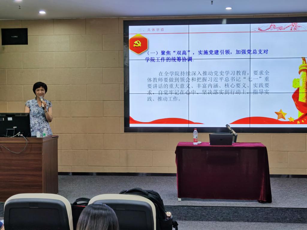 她要求,全体党员师生要持续加强学习,静心学、潜心悟,常学常新、常思常悟、常研常得,通过学习,提高认识和格局,以钉钉子的精神抓各项工作的落实,毫不松懈。要牢记初心使命,坚定理想信念,践行党的宗旨,把对党和人民的满腔热情转化到实际工作。弘扬伟大建党精神,做好立德树人工作,更好地服务师生全面发展,推动学院教育事业高质量发展。
