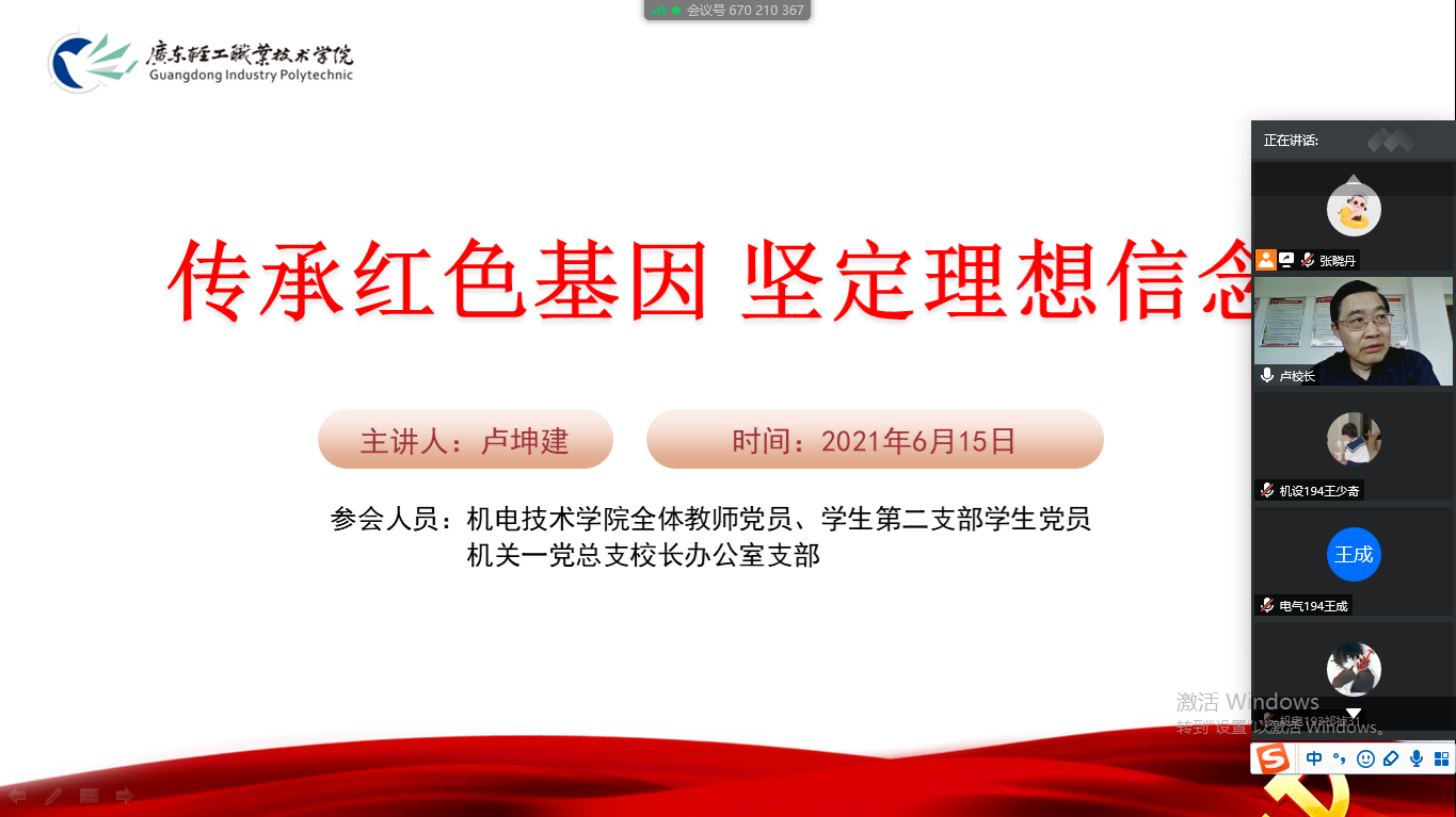 6月15日下午,学校校长卢坤建在线上为机电技术学院全体教师党员、学生第二支部学生党员和机关一党总支校长办公室支部讲授了主题为“传承红色基因 坚定理想信念”的党课,由机电技术学院党总支书记宋霞主持。