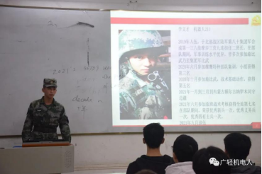 最后分享的是机器211班的李文才同学,李文才同学曾是一名特种兵。作为一名特种兵,他的军旅生活不是特别的轻松,高负荷的训练强度,使他的身体落下大大小小的伤病,但是他没有被这些挫折所击败,而且是越挫越勇,屡获表彰。