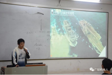首先上来的是电气201班的余伟斌同学。在海军服役的他为同学们介绍了自己的海上生活,让同学们对海军有所了解,最后为同学们展示了海军的伙食以及在海面上的风景照,让同学们对海军这支在大海上遨游的军队充满了向往。