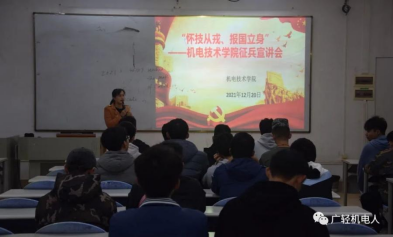 为了鼓励机电学子积极响应国家号召,应征入伍,机电技术学院于2月22日晚上在教学楼1218举行以“怀技从戎,报国立身”为主题的征兵宣讲会,由王媛老师主讲,并邀请了三位退伍学生来分享自己的军旅生活,旨在让同学们了解相关的征兵政策,了解军营生活。