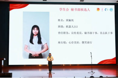 轮值主席林小慈宣读学生干部选举办法说明后,候选人依次上台演讲。每位竞选者都以出色的工作能力和积极热情的演讲,赢得台下代表的掌声,展现出新一代学生会组织昂扬的斗志和蓬勃的朝气。