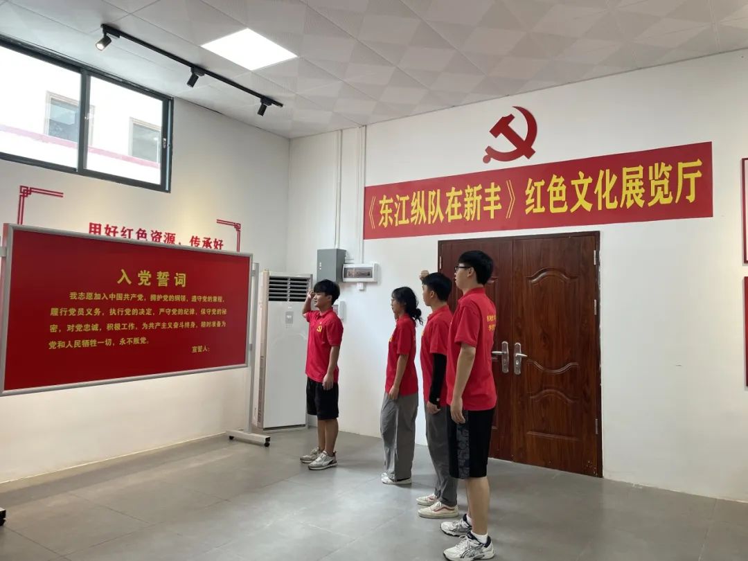为深入学习贯彻习近平新时代中国特色社会主义思想,加强大学生爱党爱国教育,7月13日,“实践‘轻’春,筑梦新丰”——广东轻院赴韶关市新丰县乡村振兴实践团在马头镇团委和指导老师的带领下,走进马头镇板岭下村,参观《东江纵队在新丰》红色文化展厅,开展重温红色记忆主题教育党课。