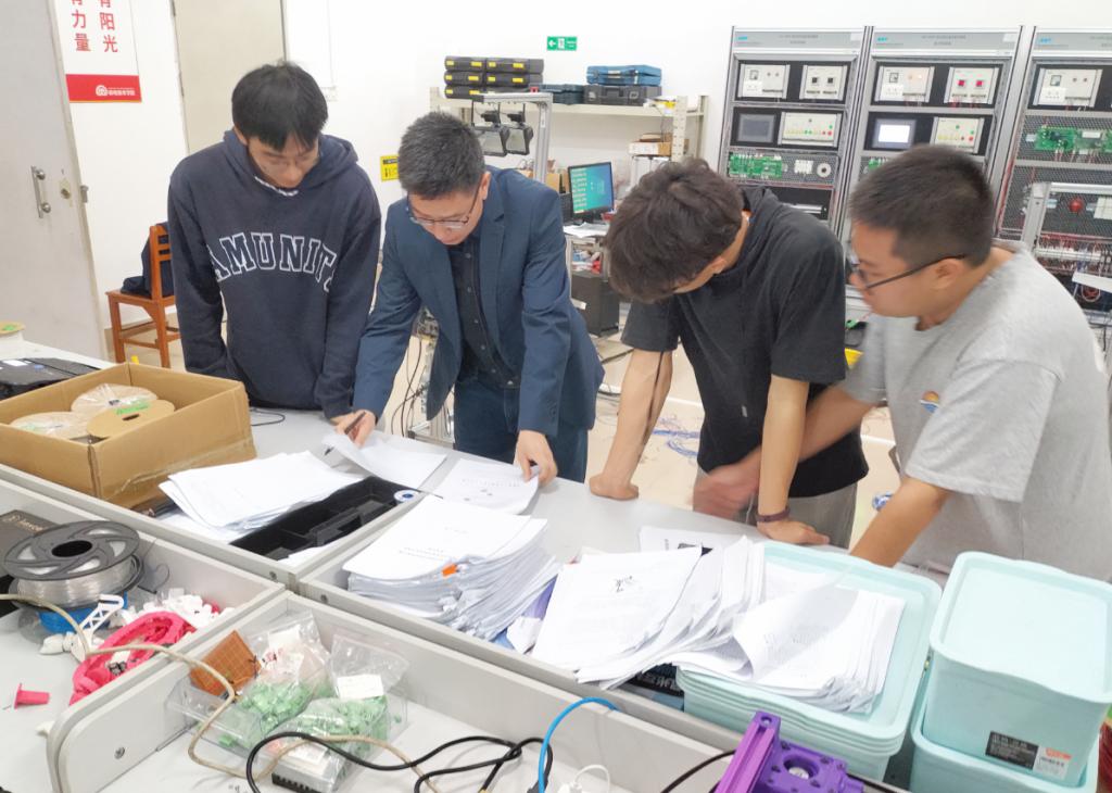 从2022年国庆开始,这个三人组就开始了早出晚归的训练。只要有时间,三个人就会泡在实训基地,通常都是早上8点出发,晚上11点返回宿舍。做好了最初的分工,三个人开始磨炼自己的那部分。有问题就集中讨论解决,解决不了就求助两位指导老师。他们训练,两位老师就陪伴左右,跟他们一起解读赛题,帮他们补充理论知识储备,解决技术难题。学院领导也给予了他们极大地期待和帮助,张友能院长常常到他们备赛现场,给他们打气,帮他们指明备赛方向,教给他们好的训练方法。