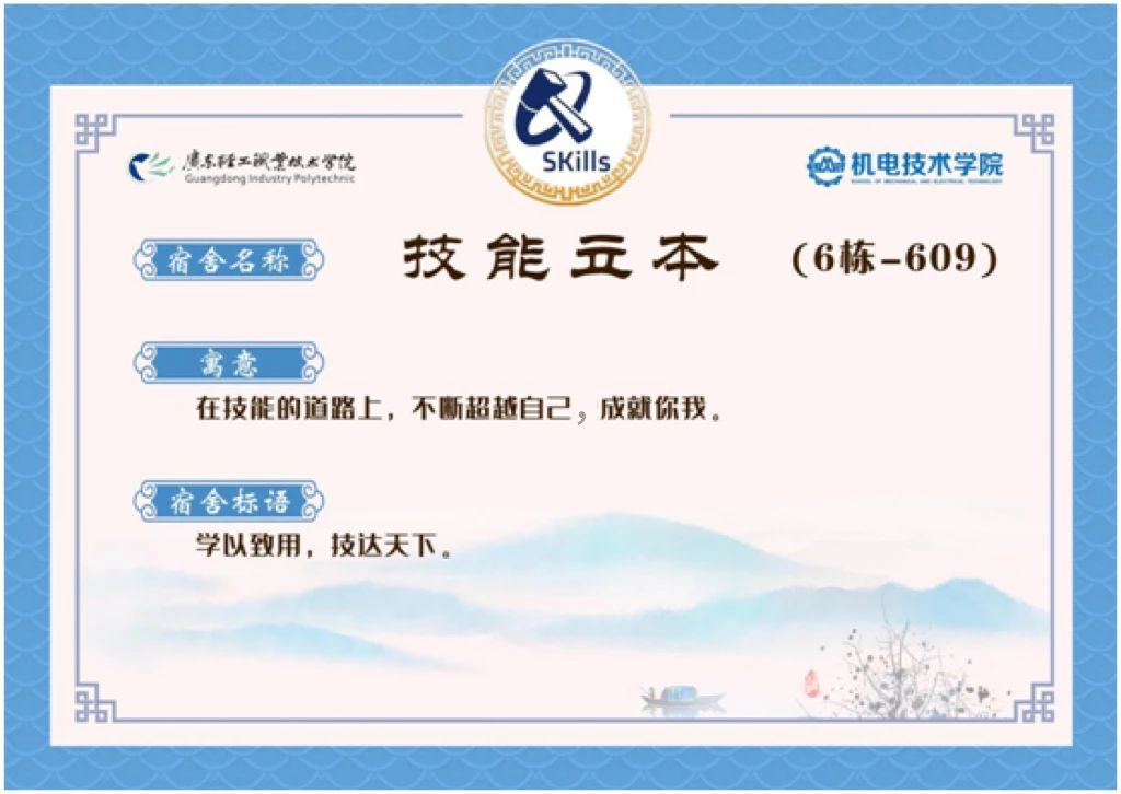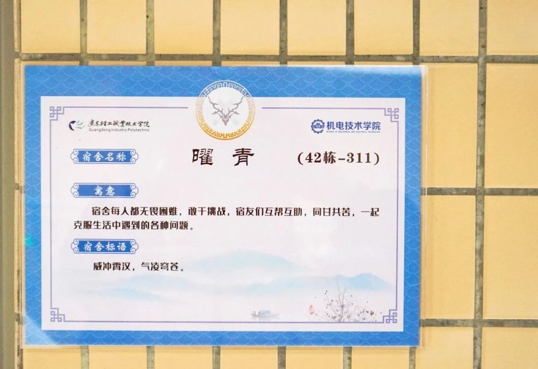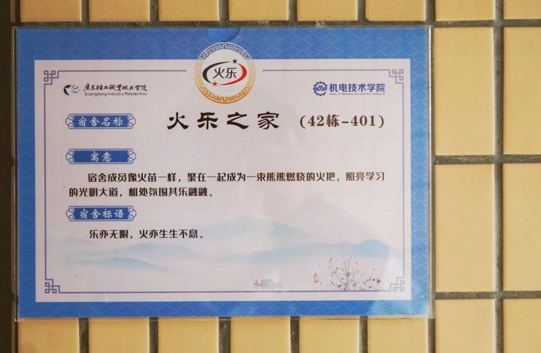 2023年12月,为了进一步构建宿舍小文化,机电技术学院在校园内掀起了宿舍文化创意热潮。活动倡议每个宿舍以独特的创意,结合宿舍舍友整体目标和特性,制定宿舍名称,阐述名称寓意、拟定宿舍标语,绘制宿舍LOGO。最终将作品统一印制出来,悬挂于学生宿舍门口墙上,向大家展示宿舍风采,提醒自己不忘初心,一往无前。