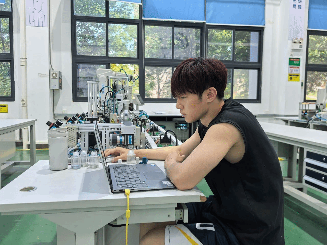 据悉,这个暑假机电技术学院共有六个国赛参赛队伍在全力备赛。在机器人系统集成应用技术项目的备赛场地,同学们早早开启了一天的训练。他们全神贯注地编写机器人控制程序,不厌其烦地调试机械臂的运动轨迹和抓取精度。为了把每一个动作的误差压缩至最小,他们已然进行了成百上千次的试验。