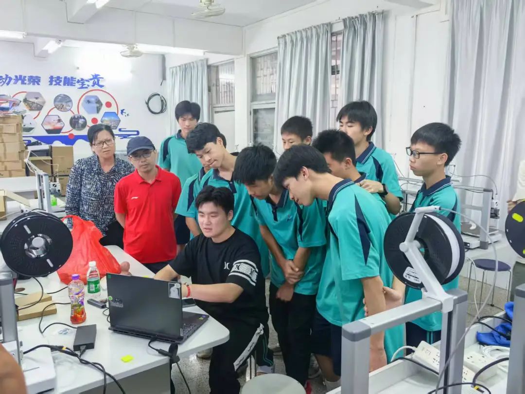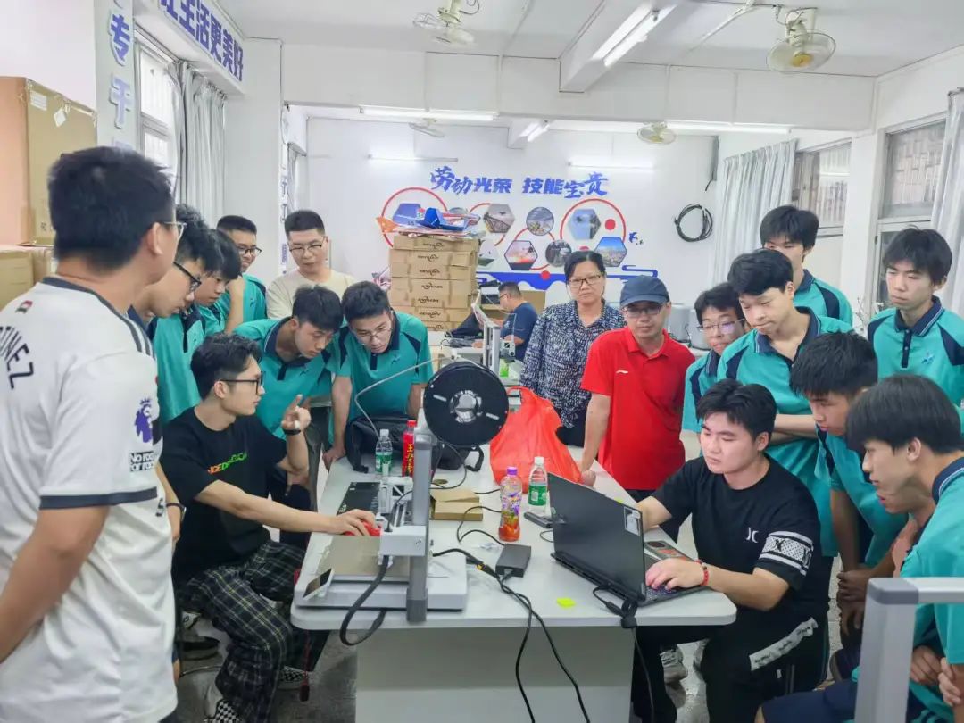 活动当天,技术团队携专业设备抵达九江职校实训室,在该实训室,带有防伪封条的全新工业级3D打印机整齐列阵。面对未开封的设备,三人迅速制定出"拆箱-组装-联调"工作流程,在九职学生志愿者的配合下,迅速做好培训活动准备工作。
