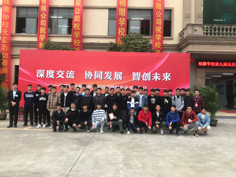 东莞市精雕职业培训第二学校举办第九届校友元旦活动暨技术交流开放日之际,诚邀我院机械类专业学生参与本届活动,以提高大学生对校外智能制造最新应用技术的认知、体验与交流。2019年12月29日,我院赵战峰老师带队,组织机制、数控专业的学生40人参会。整个活动过程包括参观校园工厂、聆听讲座以及体验精雕。