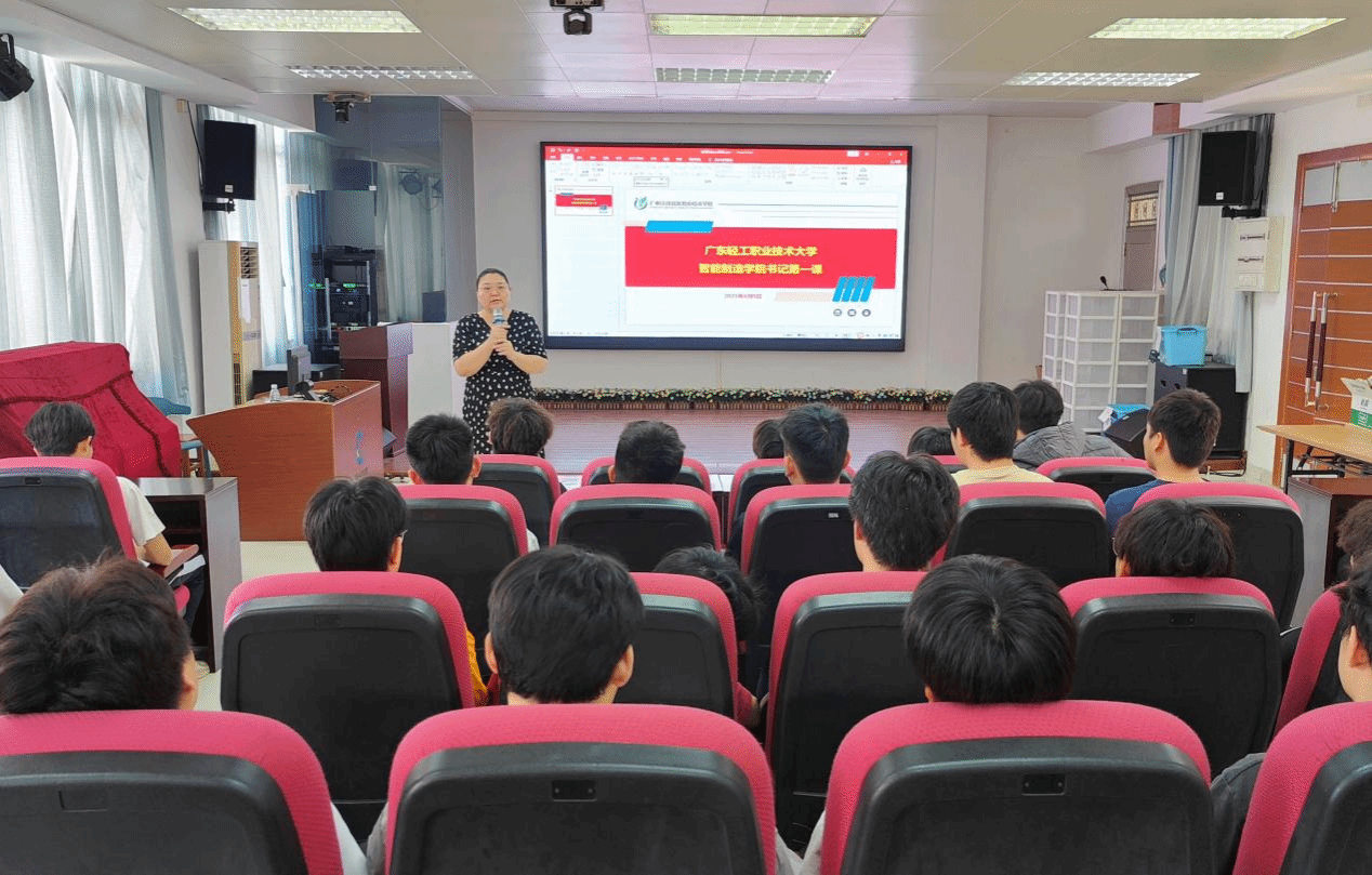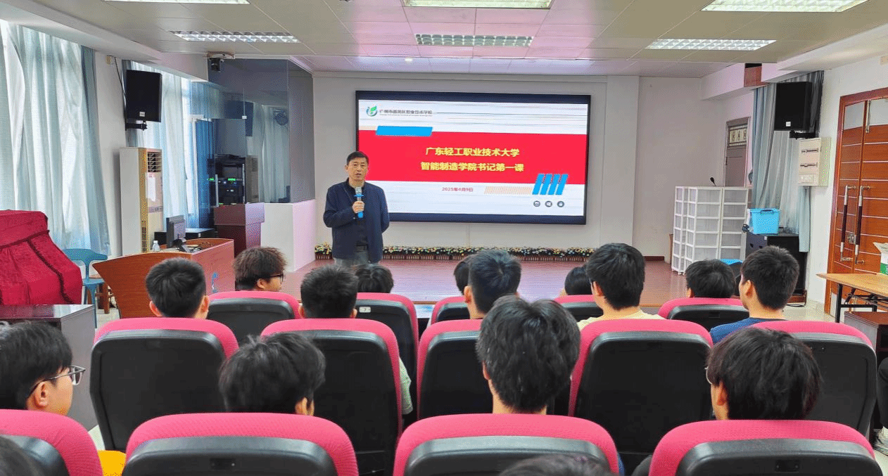 在思政第一课上,余亮彬围绕新时代大学生的使命、担当和责任与学生深入交流,他强调当代大学生应深刻认识中华民族伟大复兴的历史使命,应始终坚定“四个自信”、做到“两个维护”,将个人“小我”发展与国家“大我”发展有机融合。同时,他结合学校的发展历程、当前办学现状以及未来战略规划,让同学们明晰学校未来发展方向,切实增强了作为广轻大学子的使命感和归属感。余亮彬指出,学院始终秉持文化育人与实践育人相融合的理念,致力于培养“风雅智造人”,打造具备扎实专业知识、多元知识储备及创新能力的“π型人才”。同学们要以“思想有境界、谈吐有内涵、专业有特长、手上有绝活”为成长标准,应时刻以大学生的标准严格要求自己,持续提升思想认知水平,明确学业目标,积极追求思想进步,踊跃参与各类技能竞赛,通过实战历练提升专业技能与综合素养。余亮彬强调,在时代发展浪潮中,同学们既要扎实掌握专业核心技能,也要主动对接AI人工智能发展趋势,努力成为对国家、社会、行业发展作出积极贡献的高端技术技能人才。