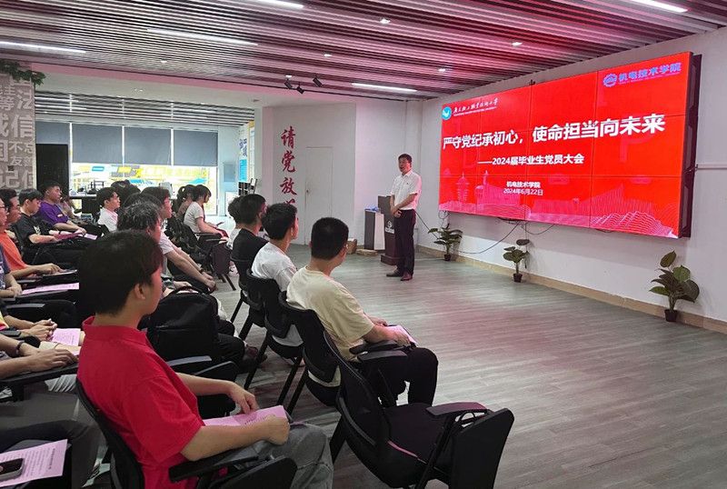 为把党纪学习教育融入每个党员心中,在2024届毕业生离校前夕,我院在南海北区思政大讲堂召开了“严守党纪承初心,使命担当向未来”2024 届毕业生党员大会。学院党委书记余亮彬、学生第一党支部书记刘林峰、学生第二党支部书记蔡崇华及全体毕业生党员共同参加本次大会。