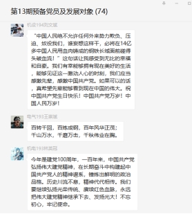 学生党员黄旭圳分享:“我们是如此的幸运,生活在这样一个伟大的时代。作为新时代的青年人,我们是这个时代的见证者,也是新时代的建设者。我们必将肩负起复兴大任,纵使道路险阻,充满挑战,但只要我们万众一心,就能披荆斩棘。”龙嘉红分享道:“看到祖国的繁荣昌盛,听到‘中国人民从此站起来’这句话,内心热血澎湃。没有共产党就没有新中国,我骄傲自己是中国人,是预备党员,我将不忘初心,牢记使命,勇于担当!向国家看齐,向党看齐,永远跟党走,忠诚于党,忠诚于人民,忠诚于国家,努力学习,努力奋斗!”
