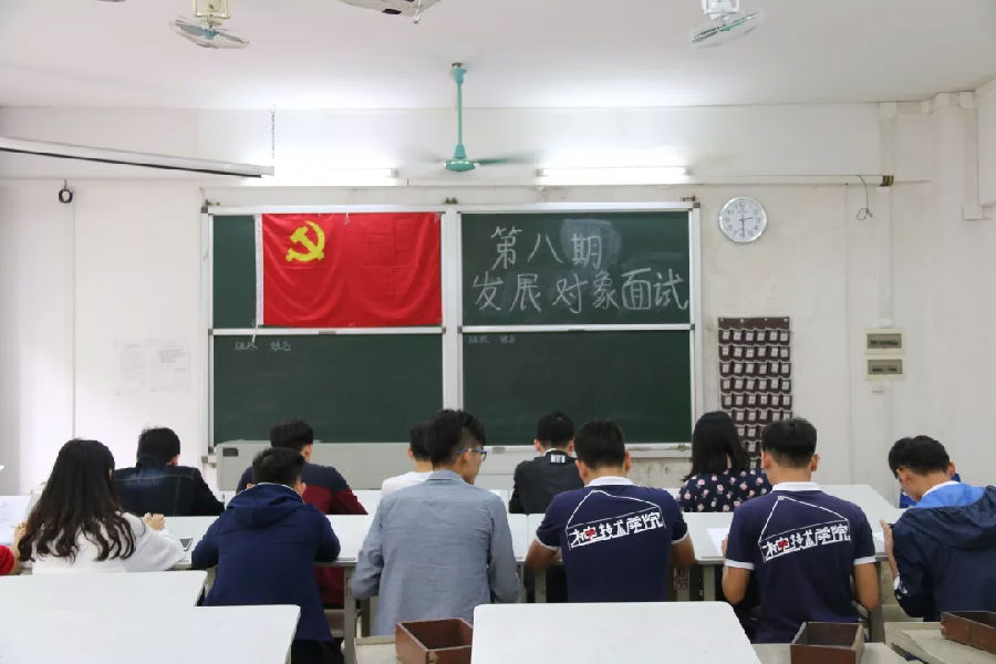 2018年10月16日,机电技术学院辅导员蔡崇华老师和王涛老师以及学生党支部、党小组在教学楼1221、1223对入党积极分子展开面试。