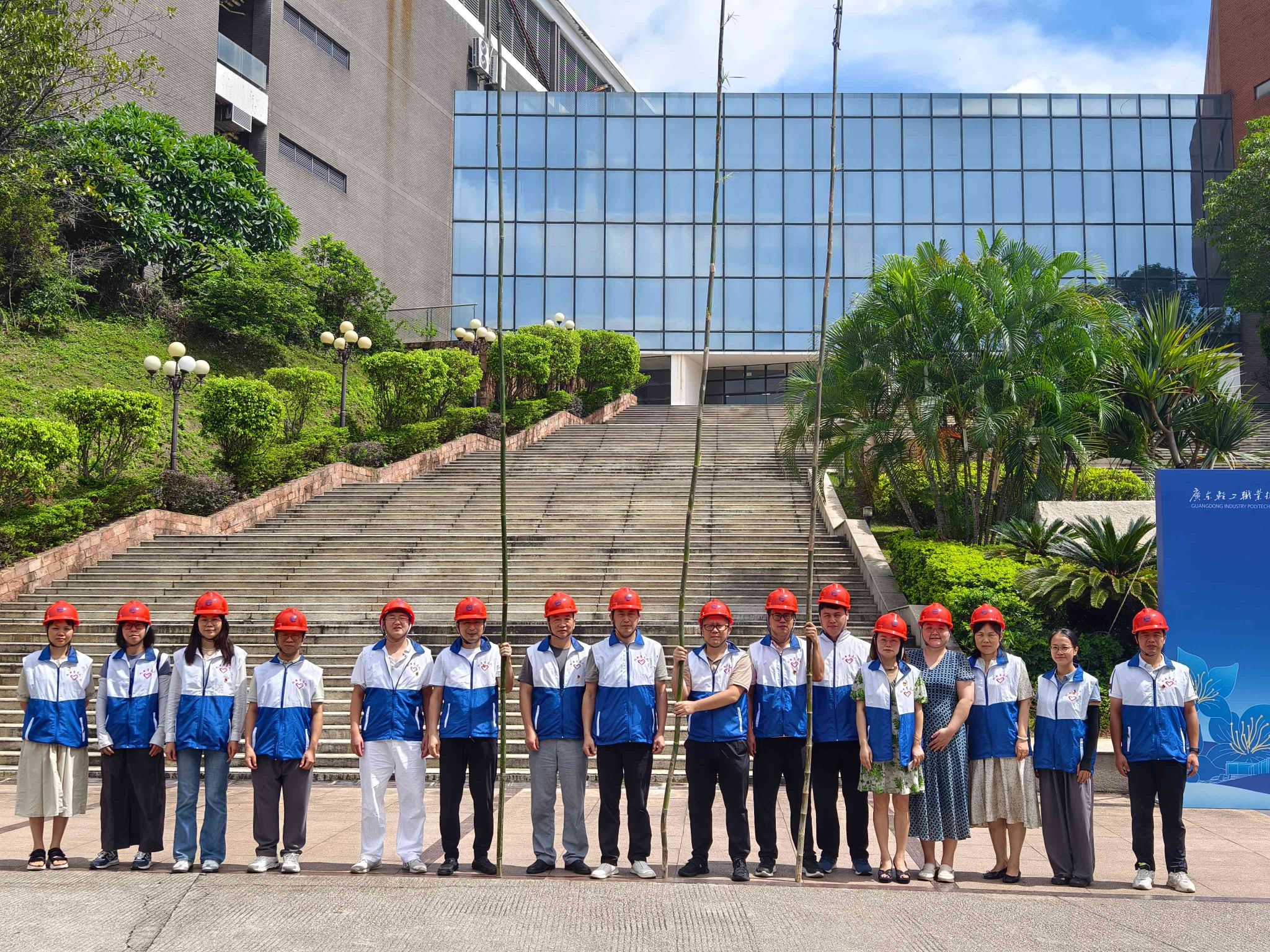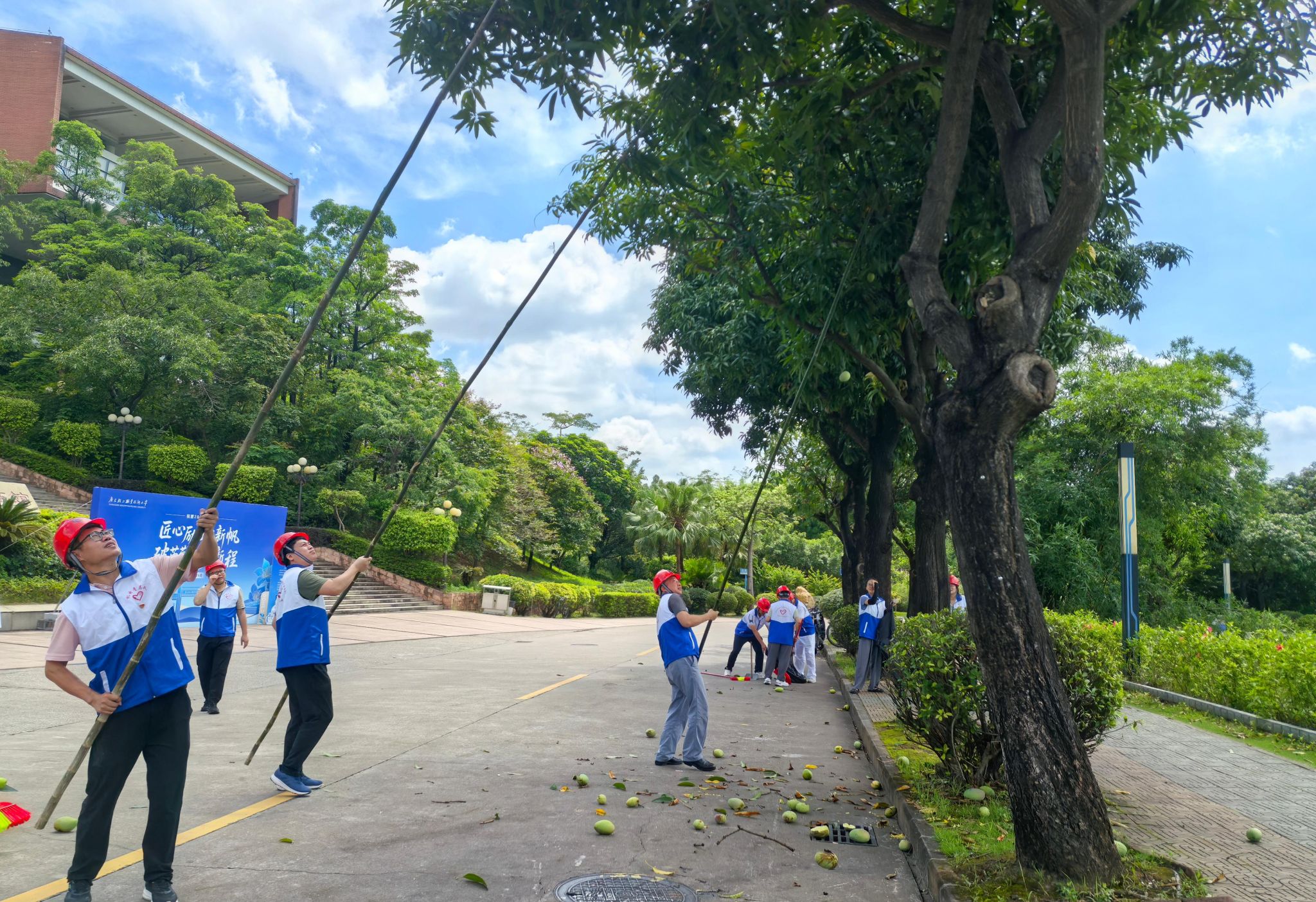 警示教育结束后,青年党员教师迅速转换角色,投身校园“打芒”行动。随着夏季来临,校园内部分树木上的芒果逐渐成熟,熟透的芒果不时坠落,给师生出行带来潜在安全隐患。青年党员教师们主动请缨,组成“打芒突击队”。行动现场,党员同志们分工明确、协同配合。警戒组率先拉起警戒线,并化身“临时交通疏导员”,引导师生有序绕行;作业组党员手持定制的 5 米长采摘杆,深入芒果树集中区域开展采摘工作;清扫组及时清除掉落地上的芒果,保持校园干净整洁。